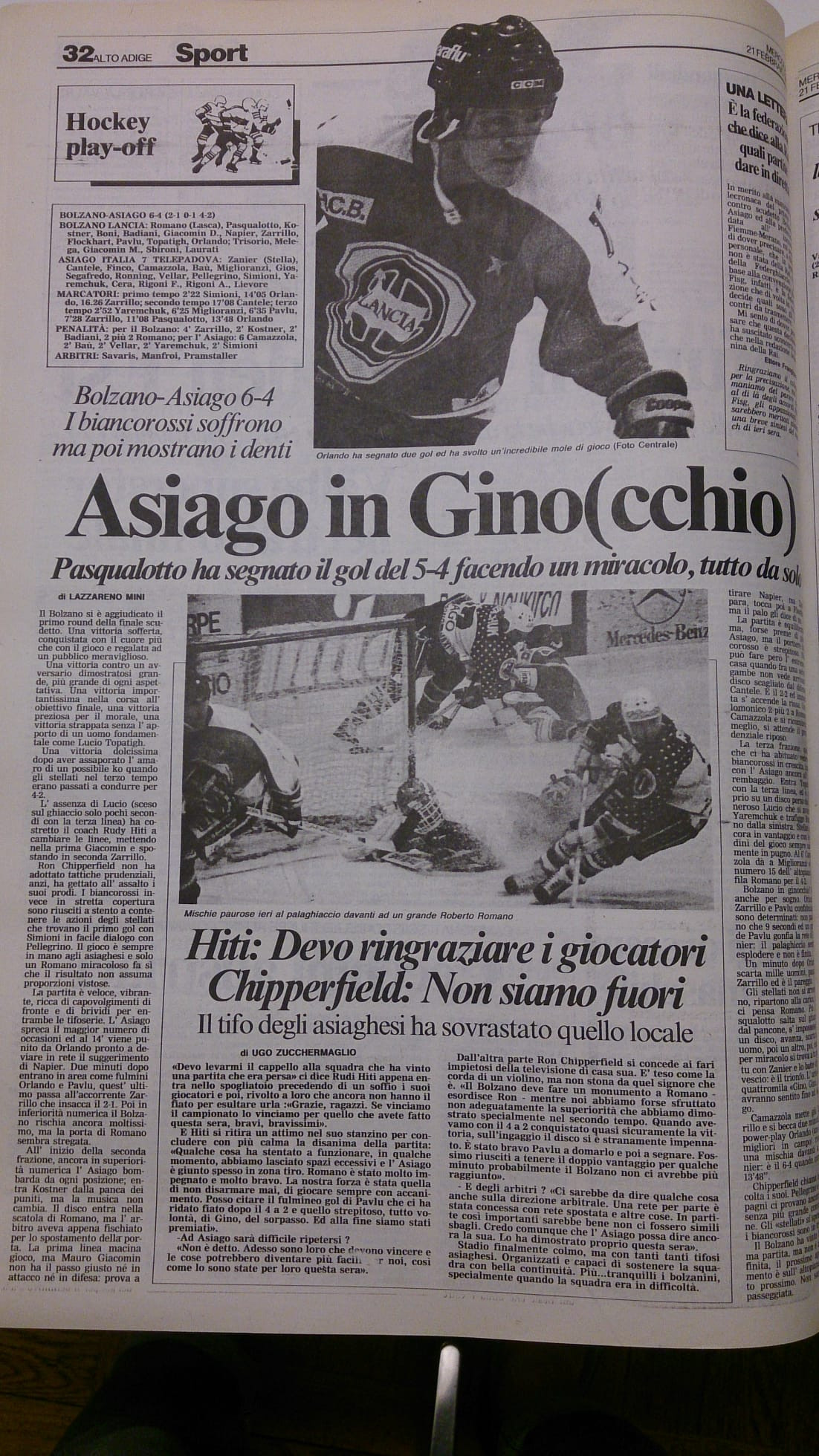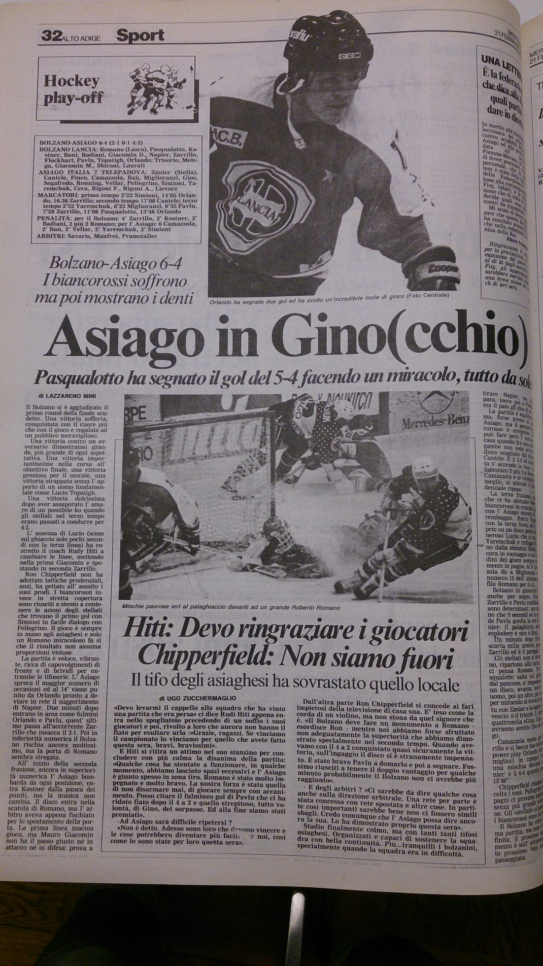In quella circostanza, Gino Pasqualotto segnò in via Roma il gol più bello ed importante della sua carriera. Con uno spettacolare “coast to coast”, all’11’08” del terzo periodo di gara 1, l’Immenso Gino riportò i biancorossi in vantaggio sul 5-4, con una prodezza assoluta. Che vanificò, assieme alle reti di Martin Pavlu e Bruno Zarrillo, il provvisorio 2-4 a 13 minuti dall’ultima sirena. Sul quale gli asiaghesi stavano già cantando vittoria. Gates Orlando siglò poi il definitivo 6-4 a 6’ dal termine. Ma l’ovazione finale, dopo un match di straordinaria intensità, fu rivolta completamente all’indimenticabile numero 33.