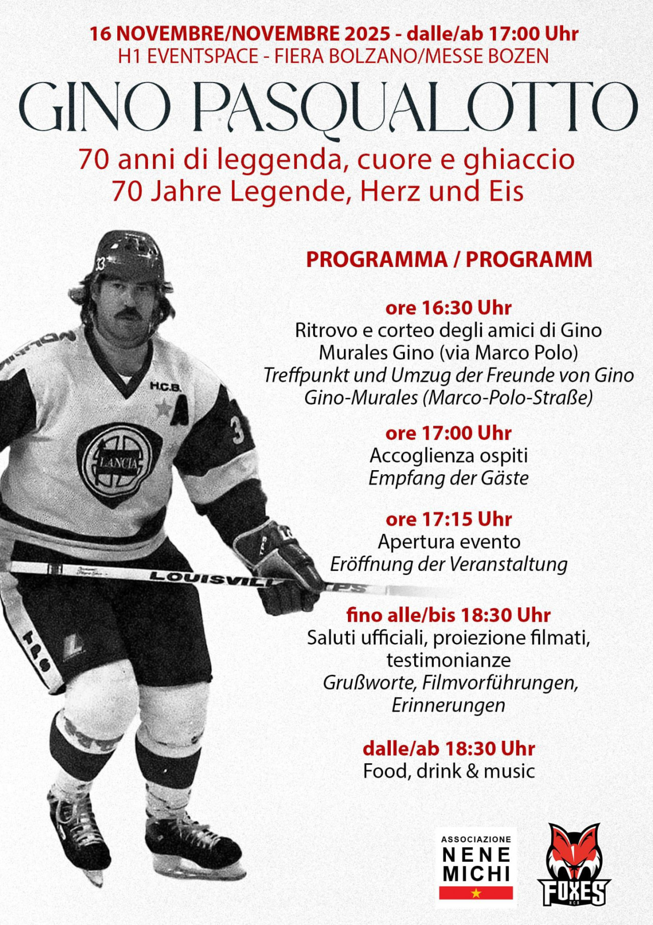 Domenica prossima, a partire dalle ore 17.00 è in programma all’Eventspace H1 della Fiera campionaria di Bolzano, una vera e propria festa dedicata ai 70 anni di tuo padre. Il titolo ha un ché di romantico: “Gino Pasqualotto, 70 anni di leggenda, cuore e ghiaccio”.