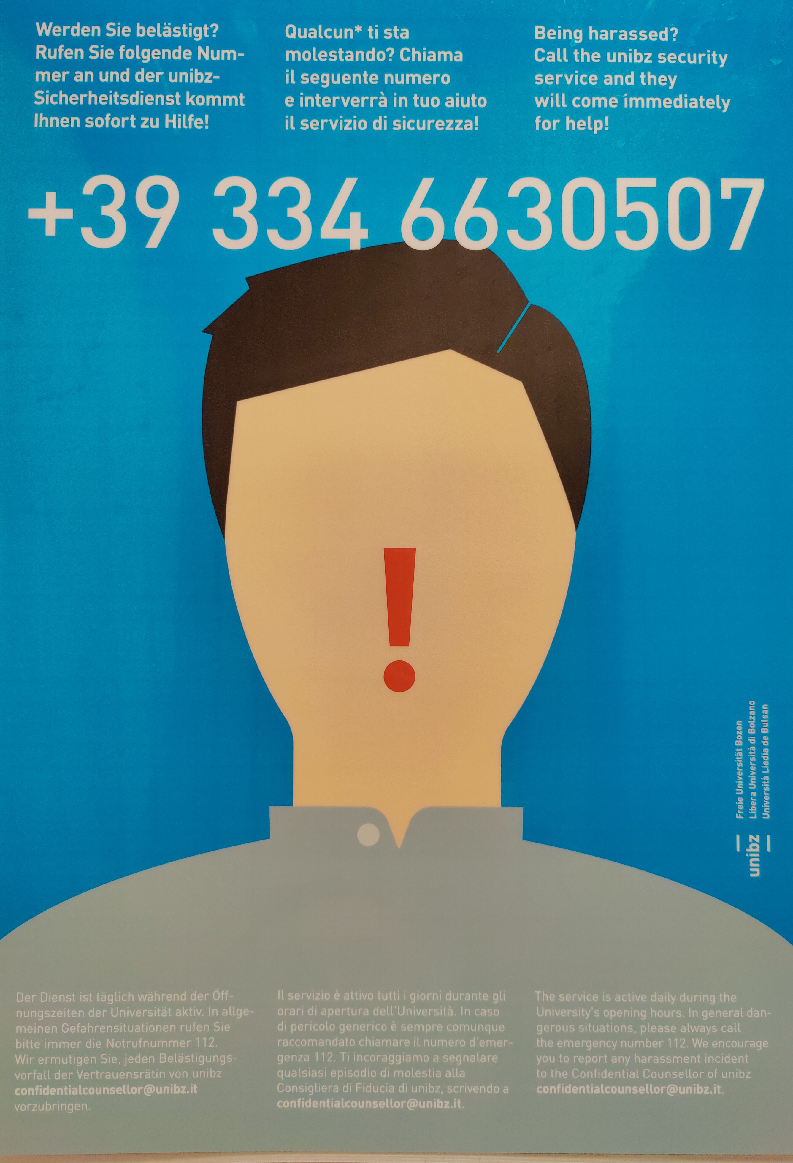 "Qualcun* ti sta molestando? Chiama il seguente numero e interverrà in tuo aiuto il servizio di sicurezza!", si legge nel volantino informativo appeso sulle porte dei bagni di Unibz, inoltre viene precisato che "il servizio è attivo tutti i giorni durante gli orari di apertura dell'Università". Le stesse informazioni sono presenti sulla pagina del sito dedicata alla sicurezza nel campus. Eppure non è così: il numero anti-molestie, di fatto, è attivo solo la sera.
