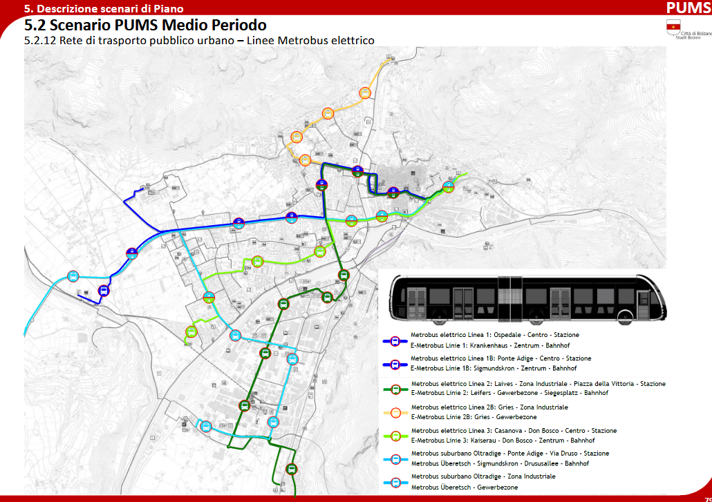 Che fine hanno fatto le restanti linee dei "metrobus elettrici"? Quella da Laives-Bronzolo, che alla fine altro non è che la linea 110/111 visto che ben difficilmente si costruirà una nuova strada nel “sacro” terreno agricolo dei pometi (ipotizzabile solo in un universo parallelo). Si è solo alle fasi preliminari sperando in fondi statali del MinTrasporti: “Per il “Metrobus II” (Bolzano-Laives) è stato assegnato da parte della Provincia un incarico per la redazione di un DOCFAP (ex progetto preliminare) e istituito un tavolo tecnico di lavoro tra gli uffici provinciali e comunali competenti. Sono stati individuate le fermate e strade comunali per i quali sono necessarie misure di adattamento infrastrutturale. Per la zona di Bozano sud, queste necessità confluiscono già nelle progettualità in corso. Invece per le parti di competenza dei comuni è necessario definire ulteriori dettagli.” Se tutto va bene, prendendo ad esempio il tunnel del Pillhof e di non pochi progetti annunciati e mai realizzati, vedremo qualcosa nel 2040…