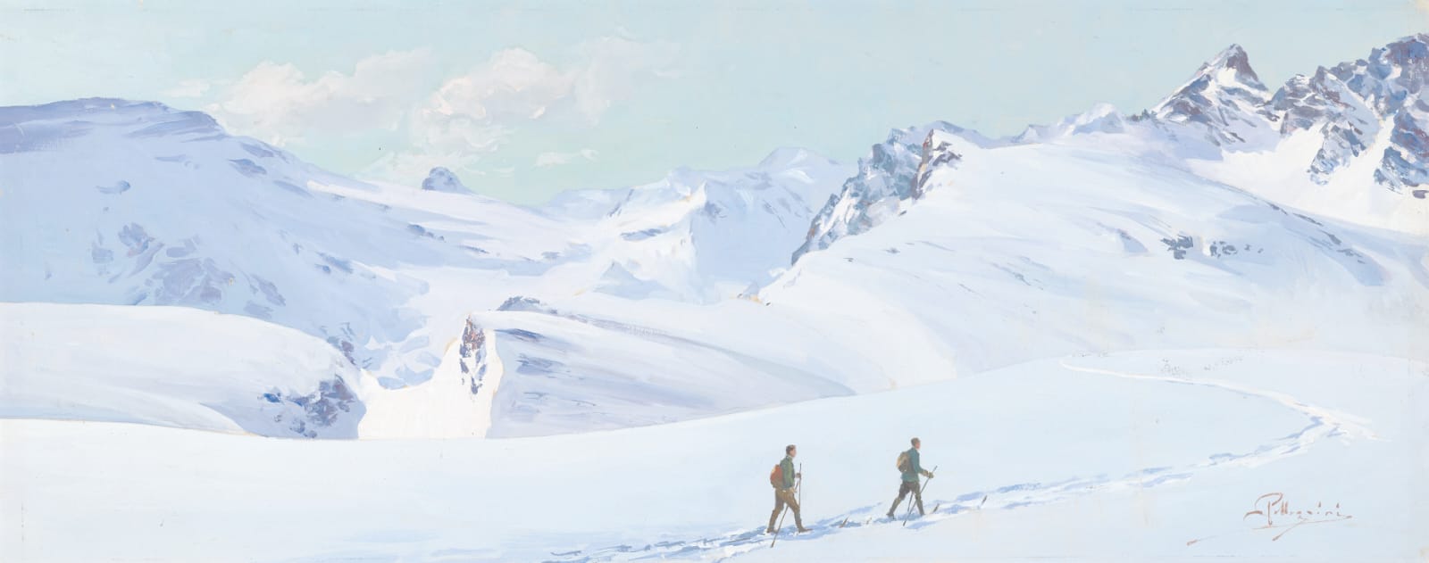 Accanto a Paul Flora, la mostra realizzata dalla Società del Museo di Bolzano -allestita in collaborazione con le Bozner Kunsauktionen e la Camera di commercio di Bolzano, che la ospita nelle sale del Palazzo Mercantile, e con il sostegno della Regione Trentino-Alto Adige- raccoglie anche opere dei cosiddetti pittori della neve, da Max von Esterle a Alfons Walde e Carlo Pellegrini (nella foto di copertina il suo Paesaggio invernale con sciatori); incisioni dei maestri della xilografia Lyoner Feuninger, Max Sparer e altri; fotografie su gelatina al bromuro d’argento realizzate da Enrico Pedrotti negli anni Venti del secolo scorso; opere grafiche da Fortunato Depero e Ivahnoe Gambini a Victor Vasarely, che esaltano le sperimentazioni formali moderne fino a quelle contemporanee, applicate al tema della neve e dei giochi invernali.