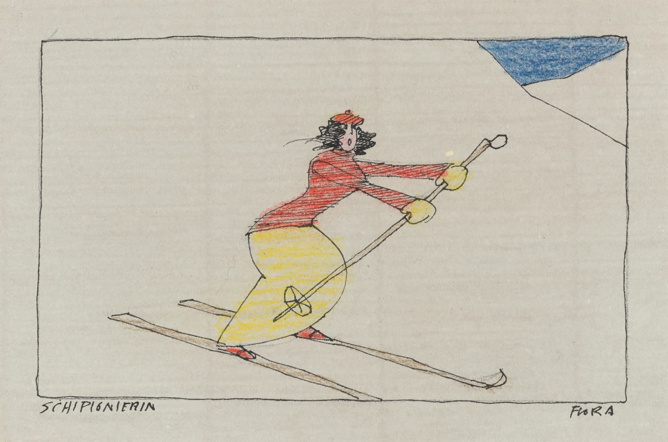 Una parte consistente dell’esposizione è dedicata alle opere di Paul Flora, prestate alla mostra dall’imprenditore e collezionista Michael Seeber. Nei disegni e acqueforti dell’artista, nato a Glorenza nel 1922 e vissuto poi a Innsbruck, che immortalano ironici pionieri degli sport invernali, dallo sci allo slittino e al pattinaggio, l’ironia e la poesia si fondono in un tratto inconfondibile. L’artista Paul Flora ricrea in filigrana, sulla punta della matita, il mondo nevoso e i personaggi che lo attraversano e lo sfidano intrepidi: sciatori dai tratti e costumi espressamente tirolesi, sciatrici, fondisti, saltatori con gli sci, slittinisti e improbabili pattinatori, ritratti caricaturalmente in equilibrio instabile e a rischio perenne di caduta, ma sempre con immancabile grazia.