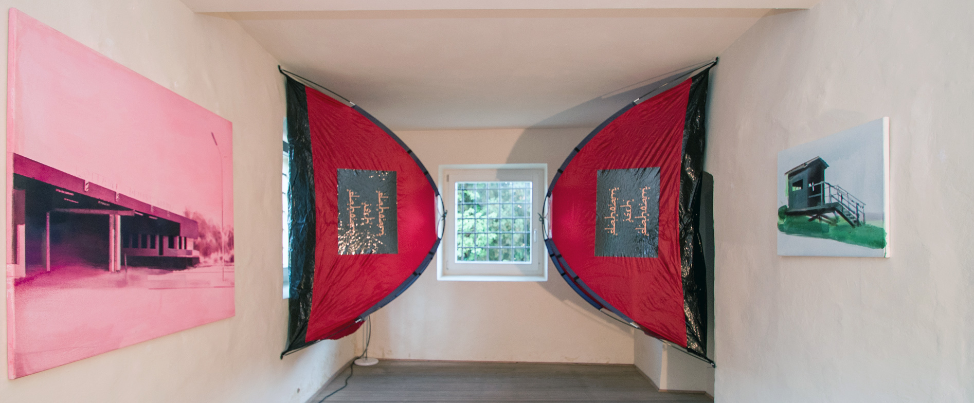 Felix Tschurtschenthaler hat Zelte an die Wand gehängt oder gestellt. Sie stehen (und fallen) für schnelles Auf- und Abbauen, für Obdacht und Zukunft.