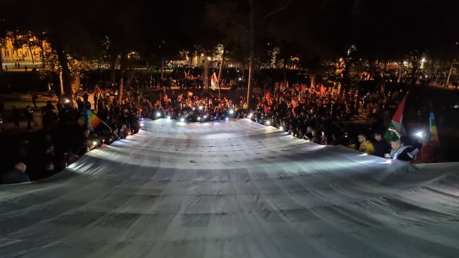In piazza c'è un sudario bianco, di venticinque metri per otto. Per sorreggerlo arrotolato serve una decina di persone, per stenderlo almeno una cinquantina. Contiene, trascritti a mano uno per uno, 18.457 nomi dei bambini e ragazzi uccisi a Gaza negli ultimi due anni. Una distesa di vite spezzate, da zero a diciassette anni, che lascia senza fiato. Un'opera d'arte e insieme un memoriale laico, costruito in ore e ore di impegno paziente da decine di volontari, per dare almeno la dignità di un nome alle vittime minorenni di quello che l'ONU chiama genocidio. Il sudario bianco è in piazza il giorno della partita della vergogna tra Italia e Israele, con oltre diecimila persone che manifestano pacificamente per la Palestina. A Udine un corteo simile non si vede da lungo tempo.