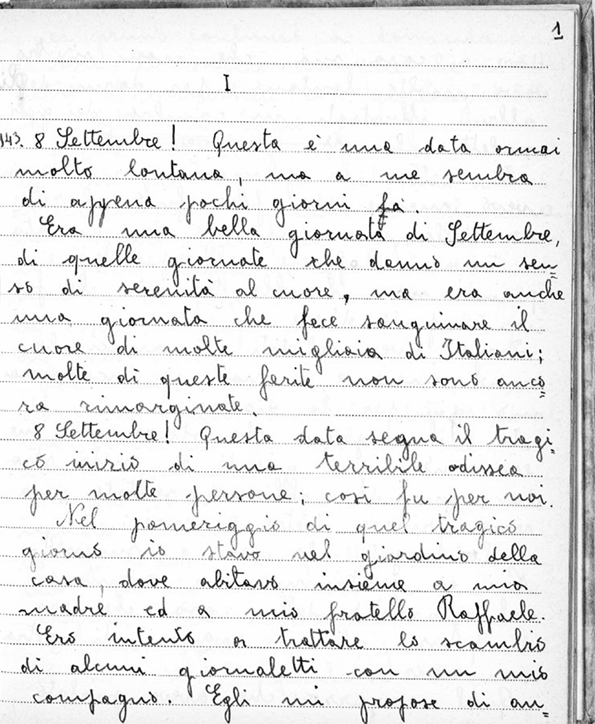 8 Settembre 1943! Questa è una data ormai molto lontana, ma a me sembra di appena pochi giorni fa. era una bella giornata di settem bre, di quelle giornate che danno un senso di serenità al cuore, ma era anche una giornata che fece sanguinare il cuore di molte mi gliaia di italiani; molte di queste ferite non sono ancora rimargi nate. 8 settembre! Questa data segna il tragico inizio di una terribile odissea per molte persone; così fu per noi. nel pomeriggio di quel tragico giorno io stavo nel giardino della casa, dove abitavo insieme a mia madre ed a mio fratello raffaele. ero intento a trattare lo scambio di alcuni giornaletti con un mio compagno. egli mi propo se di andare a casa sua, che non si trovava molto lontano, per darmi degli album illustrati in cambio dei giornaletti che io gli avevo dato. io accettai la proposta perché non avevo niente da fare fino al ritor no della mamma, che era andata a trovare raffaele nell’ospedale, e quindi non sarebbe tornata che fra un paio d’ore.