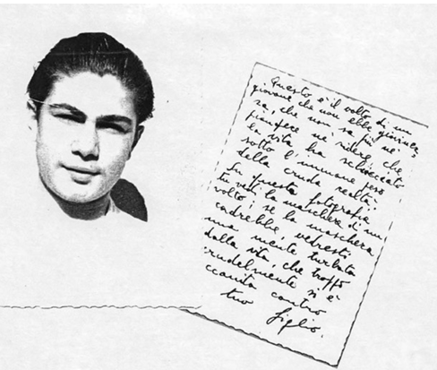 oggi è il mio compleanno. Compio quindici anni. Stamane ho pianto pensando alla attuale situazione della famiglia. Non abbiamo notizie di papà. Trovo impossibile credere che una persona possa avere un cuore così duro che, avendo la possibilità di offrirci una vita migliore in America, non lo faccia. Questo è il volto di un giovane che non ebbe giovinezza, che non sa più né piangere né ridere, che la vita ha schiacciato sotto l’immane peso della cruda realtà. Su questa fotografia tu vedi la maschera di un volto; se la maschera cadesse, vedresti una mente turbata dalla vita che troppo crudelmente si è accanita contro tuo figlio.