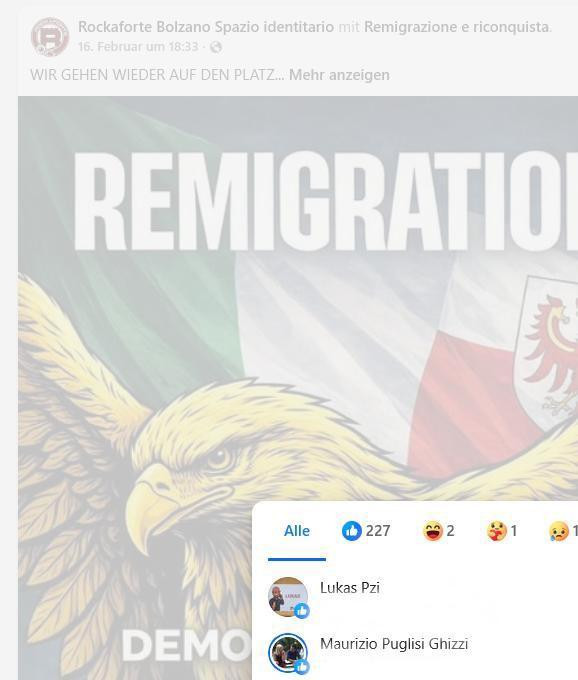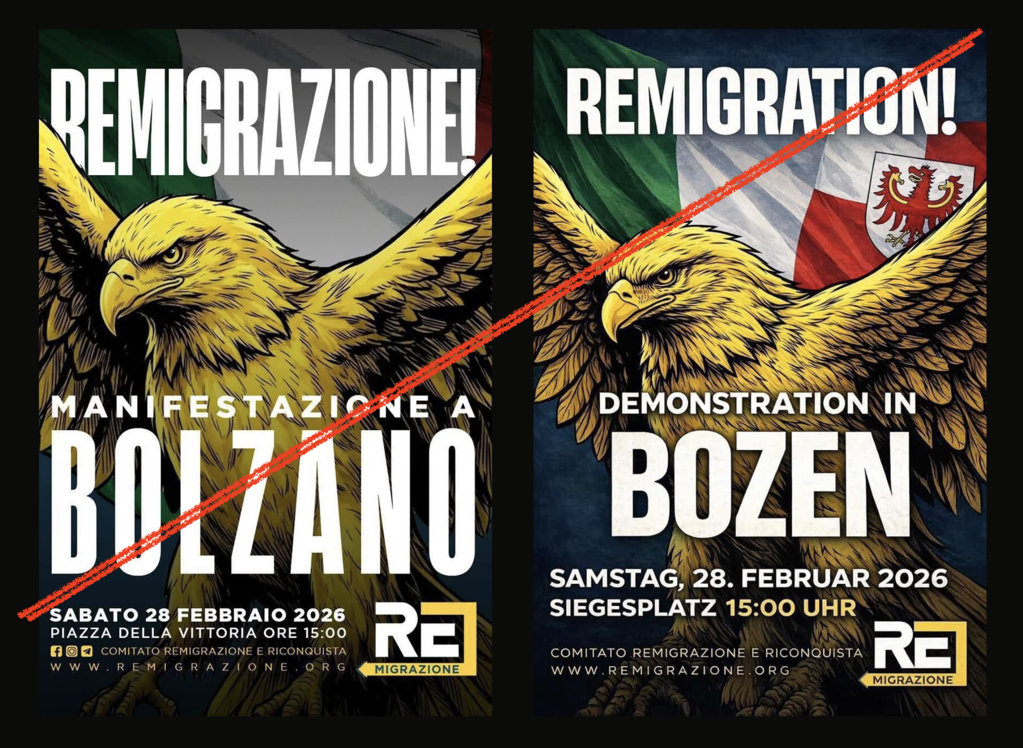 Un riferimento non troppo velato, quello della Süd-Tiroler Freiheit, a chi nella destra sudtirolese sta invece dando segnali di prossimità alla remigrazione promossa dai neofascisti italiani. Si va dalla presenza del leghista di CasaPound Massimo Trigolo alla commemorazione degli Schützen di Gries per Andreas Hofer, con tanto di foto ricordo coi “Kameraden” della Schützenkompanie “Mjr. Josef Eisenstecken”, sino al neo-comandante degli Schützen di Merano (già consigliere comunale dei Freiheitliche meranesi) Lukas Prezzi che mette “mi piace” su Facebook alla locandina in tedesco della manifestazione “Remigrazione e Riconquista”, postata dallo spazio Rockaforte di Bolzano. Un manifesto tattico, che ha ricevuto l’approvazione social di molti fan dell’estrema destra sudtirolese. Evidentemente, dopo la “grande alleanza” tra le destre di lingua italiana e tedesca in Giunta provinciale, anche le due destre estreme sudtirolesi iniziano a parlare la stessa lingua.