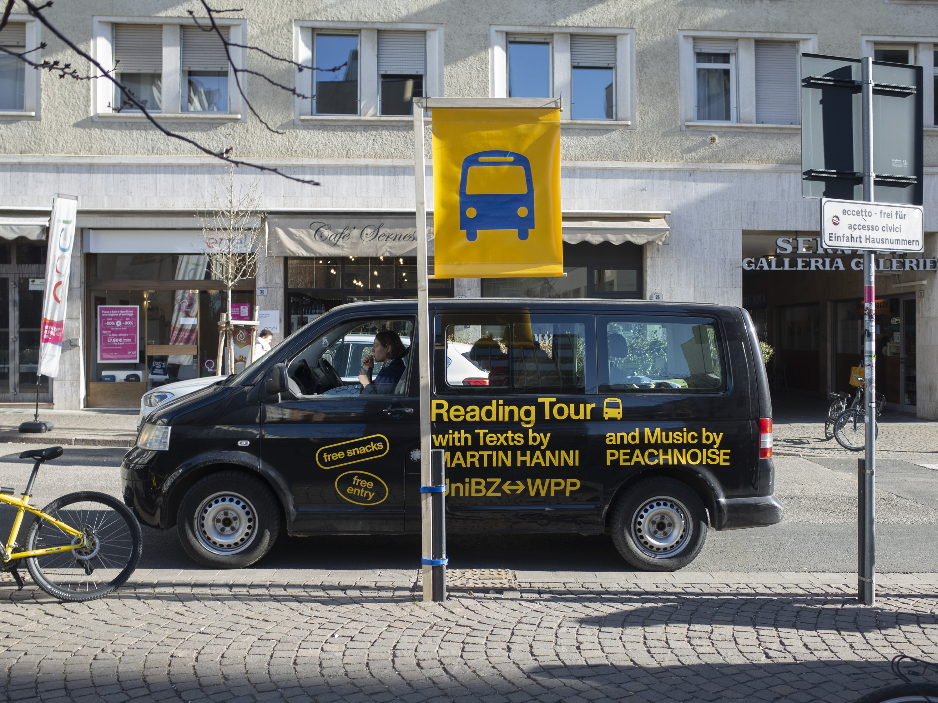 Il concetto prende la forma di una performance: una fermata costruita ad hoc, un van Volkswagen trasformato in autobus, biglietti stampati e distribuiti in università. Mercoledì 21 gennaio il progetto prende vita con corse ogni 20 minuti. Il percorso è sempre lo stesso: partenza dall’università, breve giro per Bolzano, ingresso nel parcheggio del WaltherPark, una sosta di nove minuti e mezzo, poi il ritorno. “Per sottolineare il contrasto tra spazio pubblico e spazio privato ho deciso di utilizzare i 10 minuti di permanenza gratuita nel parcheggio di Waltherpark per effettuare il tour senza dover pagare”.