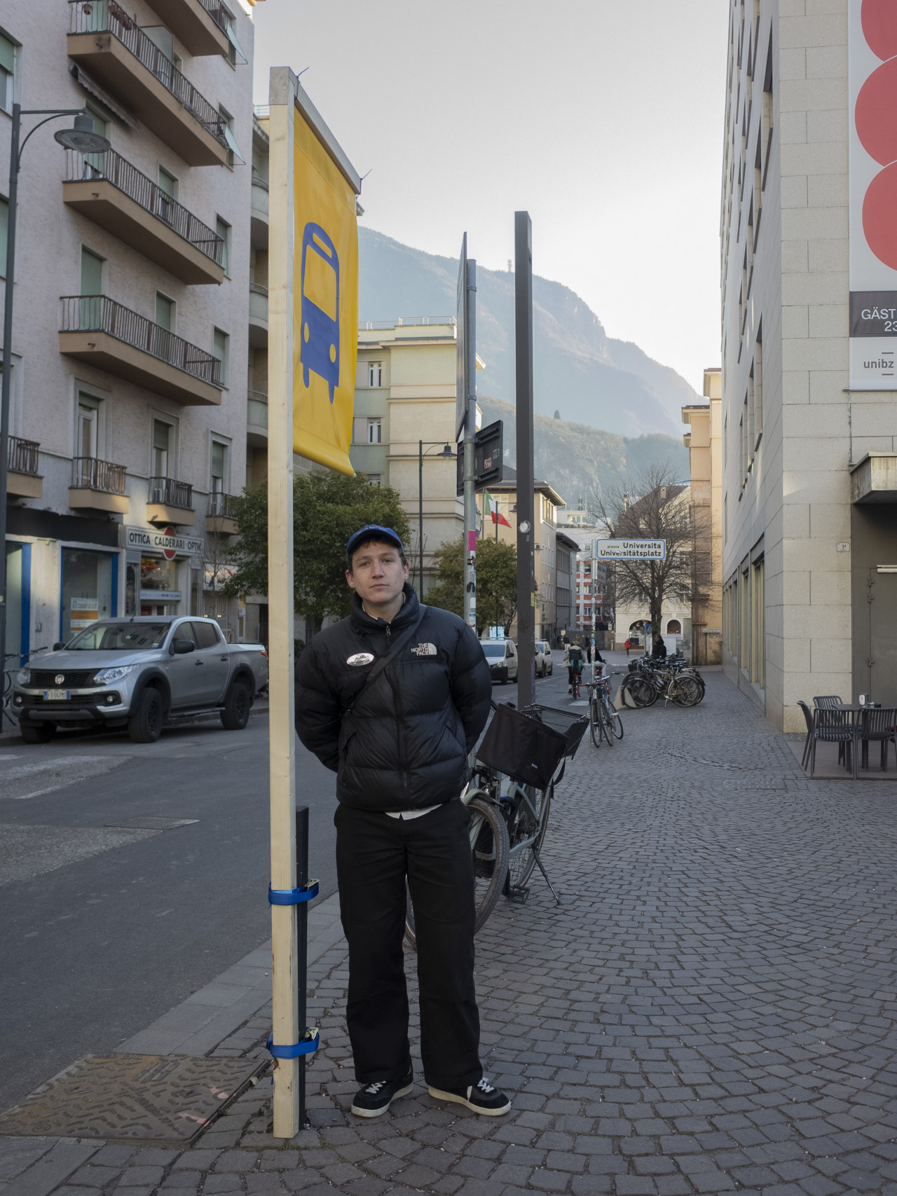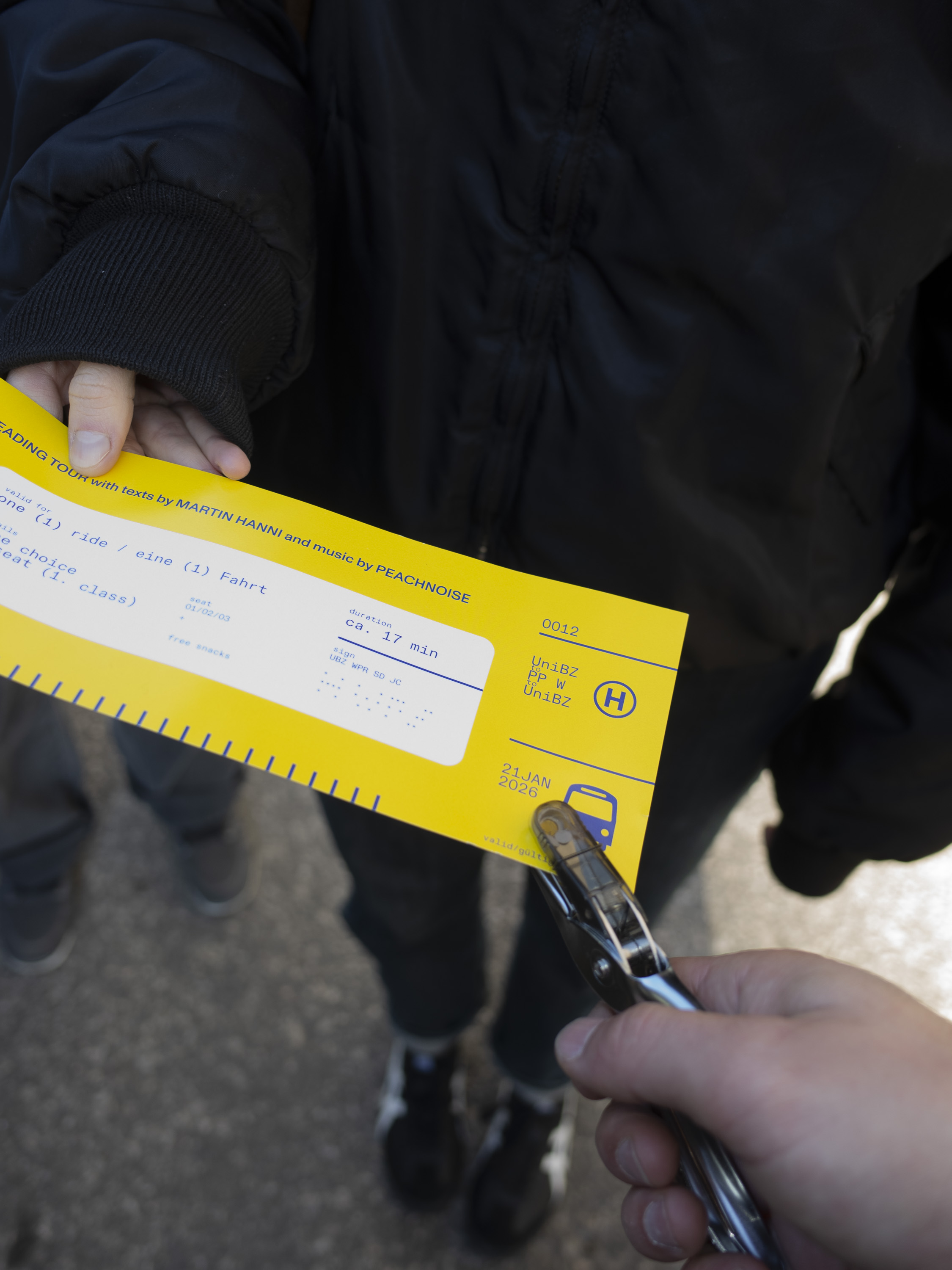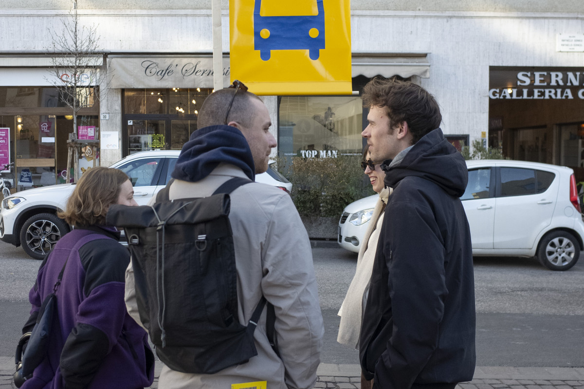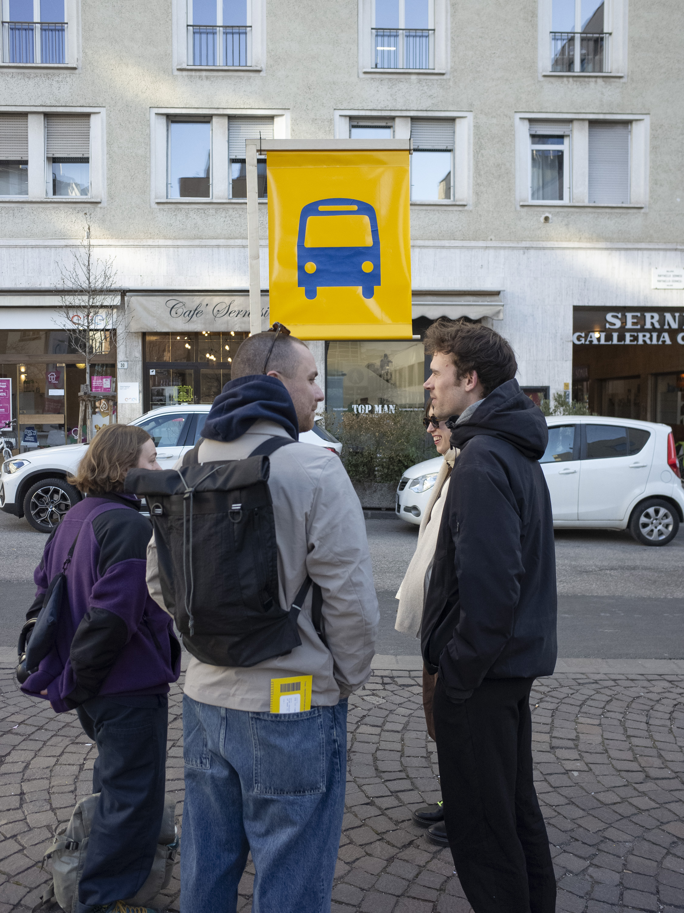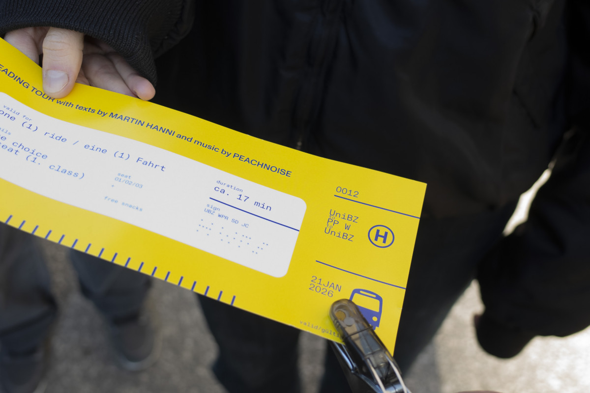Davanti all'Università di Bolzano compare una fermata dell’autobus. Il mezzo arriva puntuale, vengono controllati i biglietti e le persone salgono a bordo. Non si tratta però di una linea urbana, ma di una performance artistica: un tour che conduce studenti e docenti dall’università al parcheggio del WaltherPark. Il progetto realizzato il 21 gennaio è firmato da Jonathan Coen, studente del nuovo master Critical Creative Practices di Unibz, e nasce come una riflessione sul concetto di privatizzazione dello spazio pubblico.