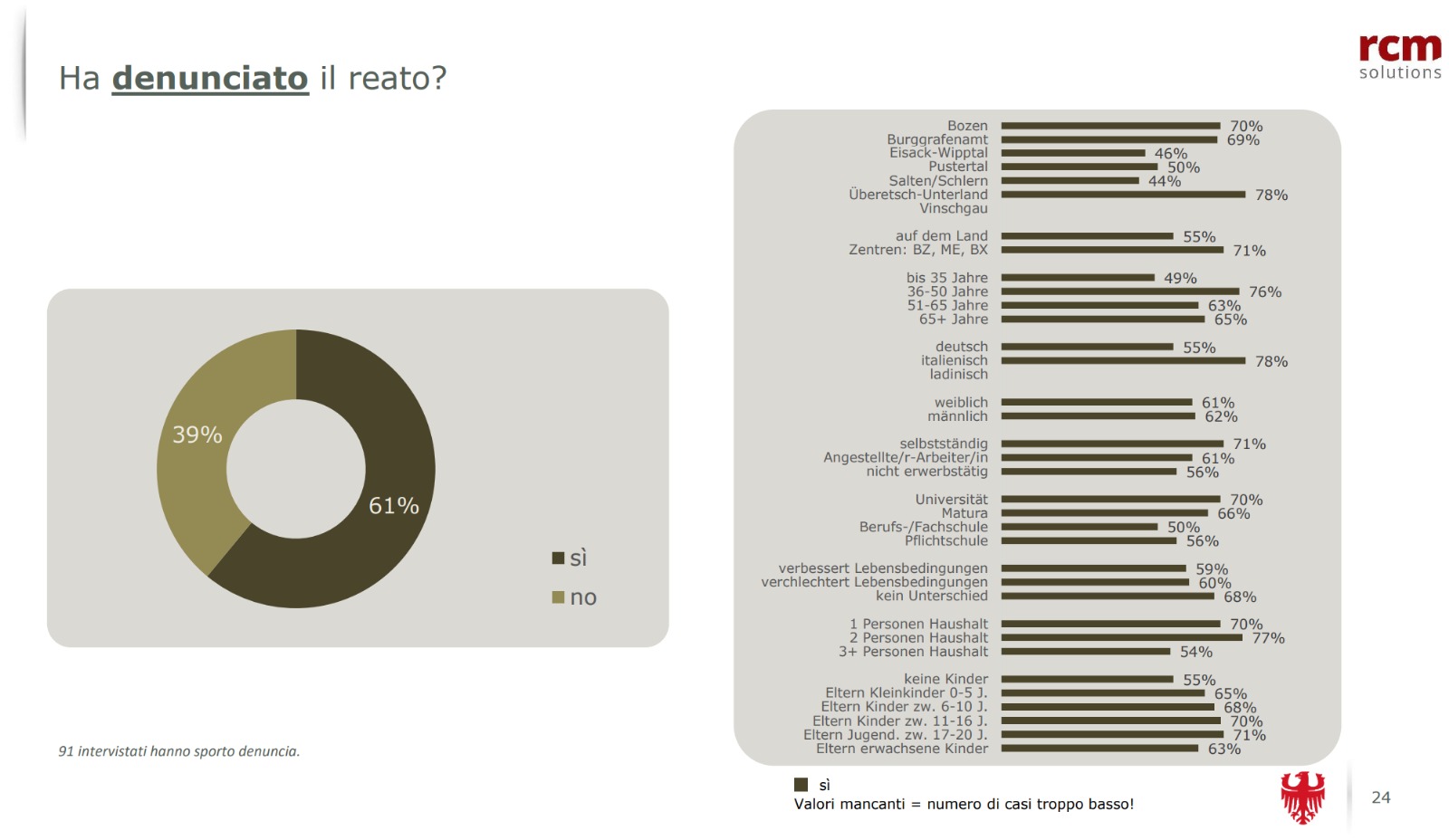 Inoltre, lo studio evidenzia come solo il 61% degli intervistati che sono stati vittime di un reato ha sporto denuncia. Anche la soddisfazione per il trattamento di un caso da parte della polizia/delle autorità è solo di 7 punti, con valori particolarmente bassi per la rapidità dello svolgimento dei procedimenti giudiziari (6,1 punti). Il lavoro delle Forze di polizia statali e della Polizia locale riceve valutazioni contrastanti: la le Forze dell’ordine statali ottengono un punteggio positivo per la cortesia e la professionalità, ma perdono punti per l'insufficiente bilinguismo. La Polizia locale, invece, ottiene un punteggio positivo proprio in questo ambito, ma viene percepita come leggermente meno competente e cordiale rispetto a quella statale. Il 67% degli intervistati è favorevole a un potenziamento di quella locale per migliorare la sicurezza pubblica.