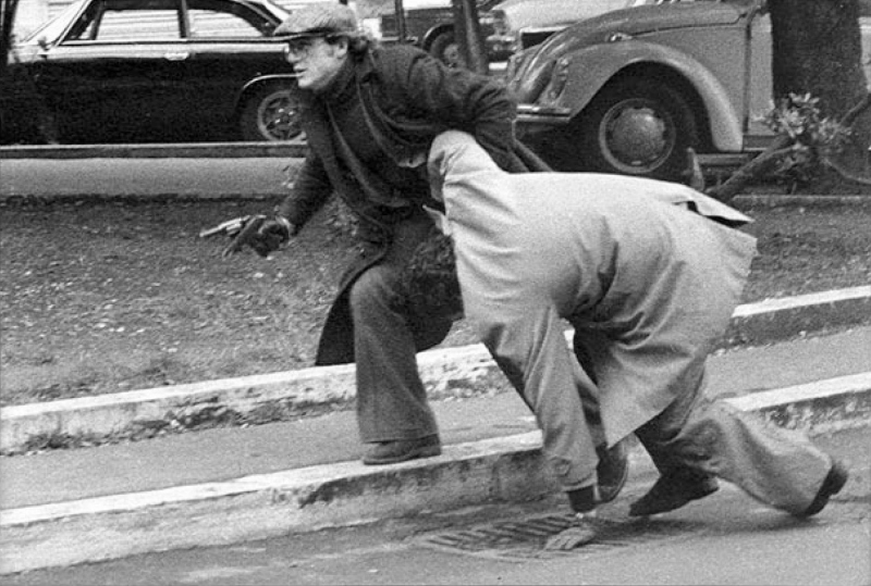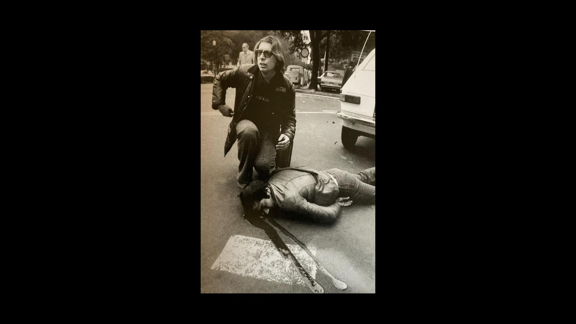 Un’altra sequenza fissata da un obiettivo pochi istanti più tardi ritrae Alexander Langer, allora 31enne, direttore di Lotta continua e prof di Liceo nella capitale, accovacciato con le mani giunte, lo sguardo attonito, come a dire, “Ma cosa avete fatto”? Davanti a lui, esanime, faccia piantata nell’asfalto, il corpo di un uomo che perde copiosamente sangue dalla testa. E’ il poliziotto Domenico Arboletti. Sullo sfondo, il retro della 127 bianca.